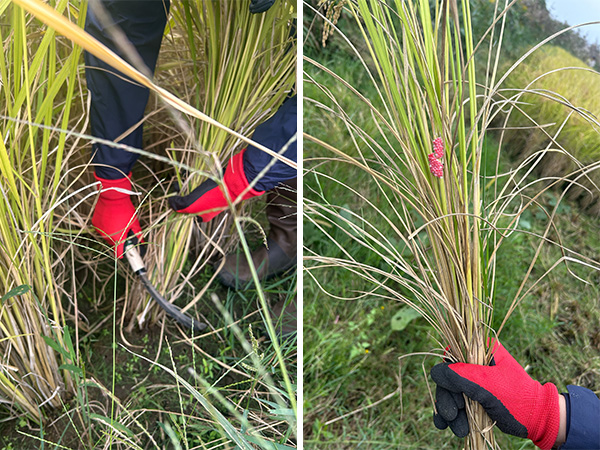 鎌を使って一束ずつ稲を刈り取り、束ねていきます。