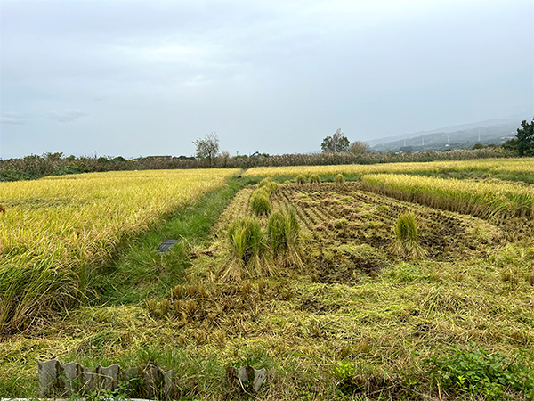 刈り終えた田んぼでは、刈り取った稲を束ねて並べ、次の乾燥や脱穀作業に備えます。